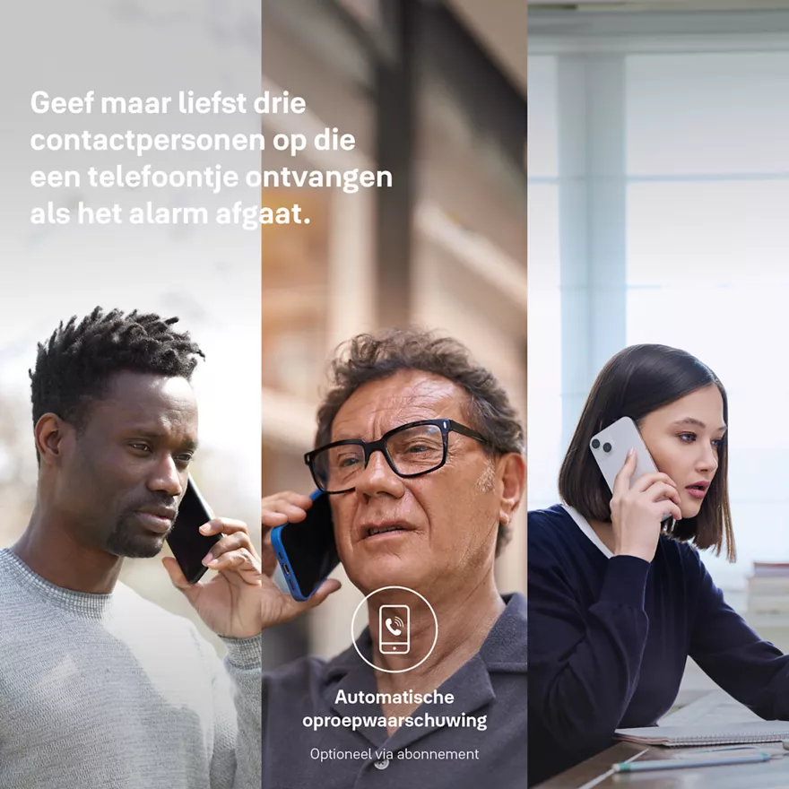 Wijs tot drie personen aan om een geautomatiseerd telefoontje te ontvangen wanneer je alarm af gaat. Wanneer je alarm wordt geactiveerd, belt het systeem automatisch de aangewezen contacten, zodat zij snel op de hoogte worden gebracht.