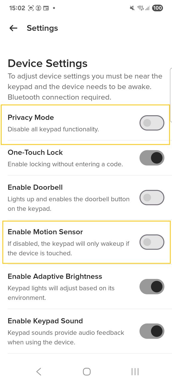 * Je moet binnen het Bluetooth-bereik van de keypad zijn om deze instellingen in- of uit te schakelen.