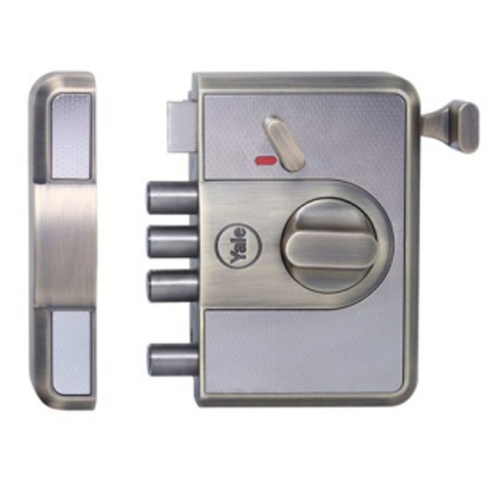 Cinco premium Main door RIM locks for Home with Knob Inside, 1 Latch and 4 Dead Bolts SS304 material, Antique brass color body. Suitable for 25-85mm door thickness doors. Designer pull for the latch holding mechanism.
