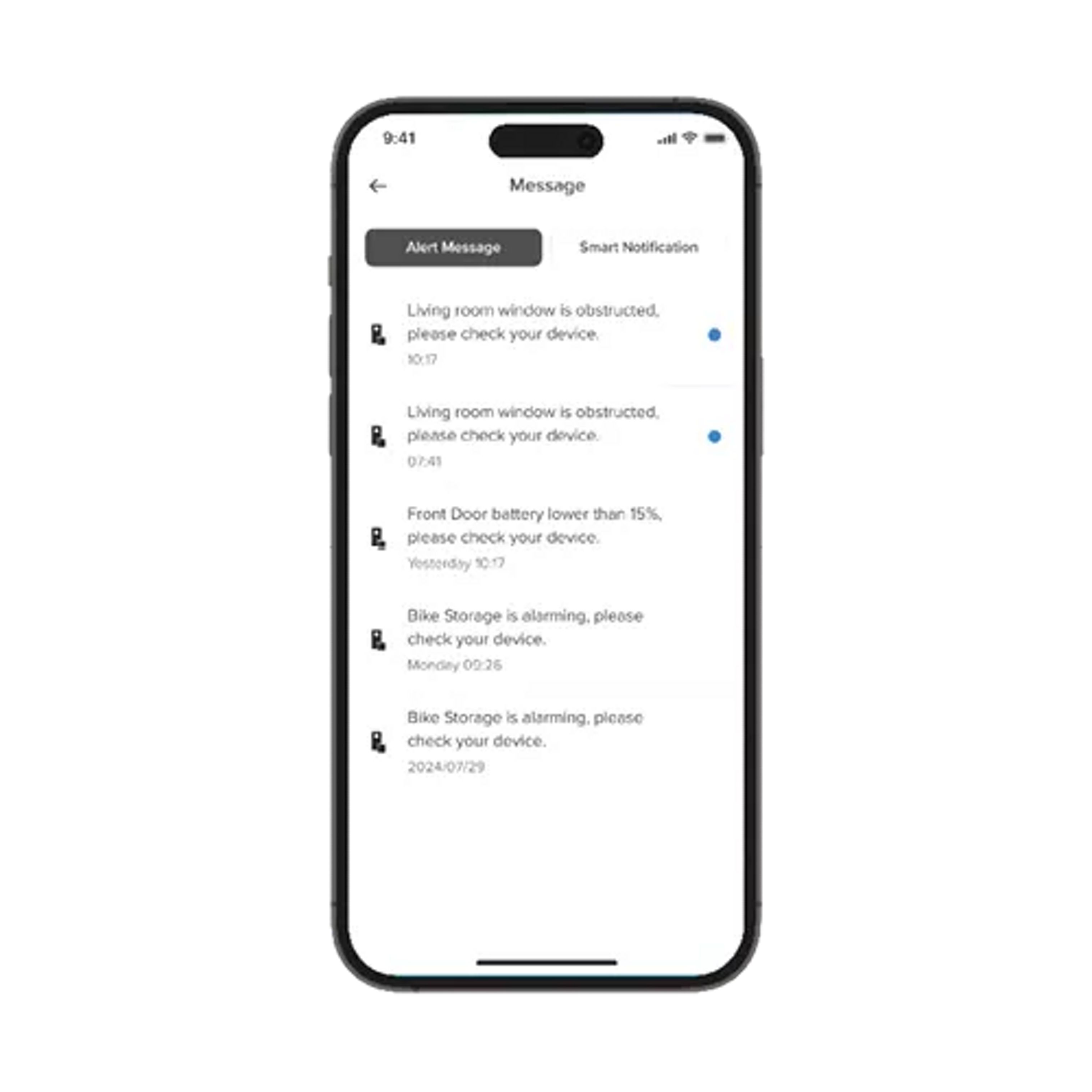 View alerts, automation updates, and device messages in one streamlined inbox with read/unread indicators.
